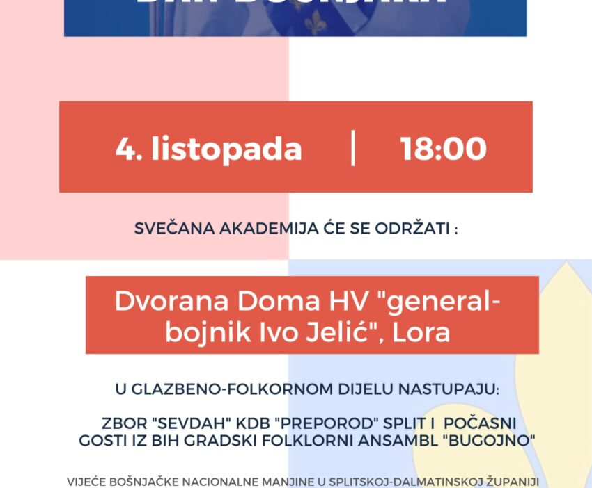 Ovam svečanom akademijom bošnjačke asocijacije koje djeluju u gradu Splitu i Splitsko-dalmatiskoj županiji obilježili su Dan Bošnjaka, odnosno 32. godišnjicu