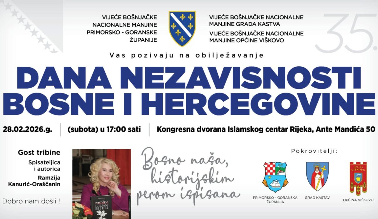 U subotu, 28. februara 2026. godine s početkom u 17:00 sati, kongresna dvorana Islamskog centra u Rijeci bit će mjesta održavanja svečane tribine pod nazivom “Bosno naša historijskim perom ispisana”.